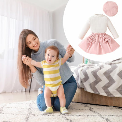 Exit les tenues inconfortables qui irritent la peau sensible de votre enfant! Avec son haut à manches longues orné d'un joli nœud, sa jupe au design irrégulier et son adorable béret assorti, votre petite princesse sera à la fois à l'aise et ravissante.